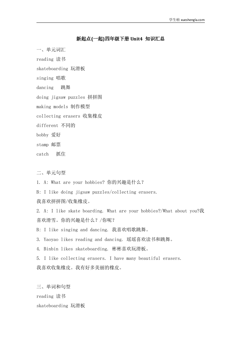 首页小学英语四年级人教新起点英语四年级下册Unit4知识点汇总