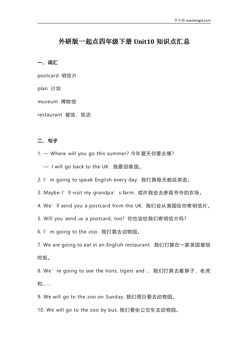 首页小学英语四年级外研版一起点四年级下册Unit 10知识点汇总