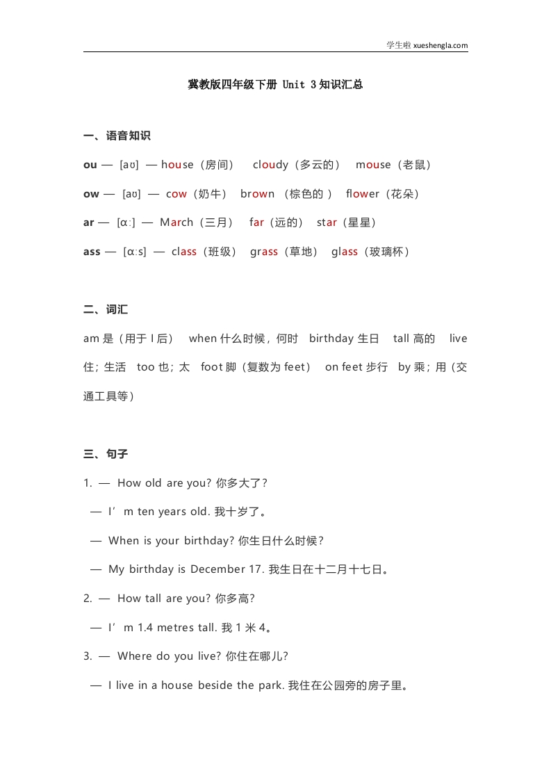 冀教版四年级下册 Unit 3知识汇总
