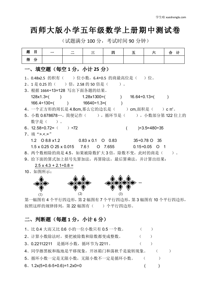 首页小学数学五年级西师大版小学五年级数学上册期中测试卷