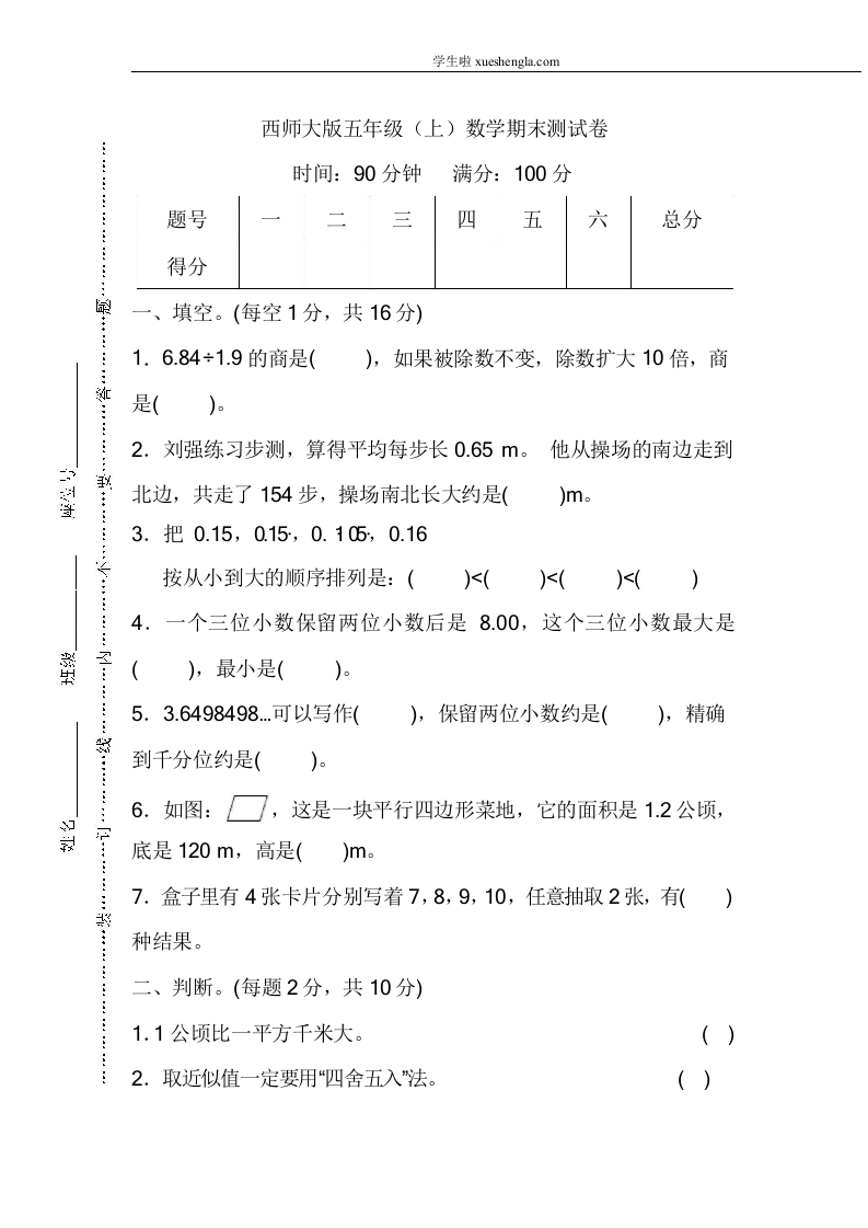 西师大版5年级数学上册期末检测卷(附答案)