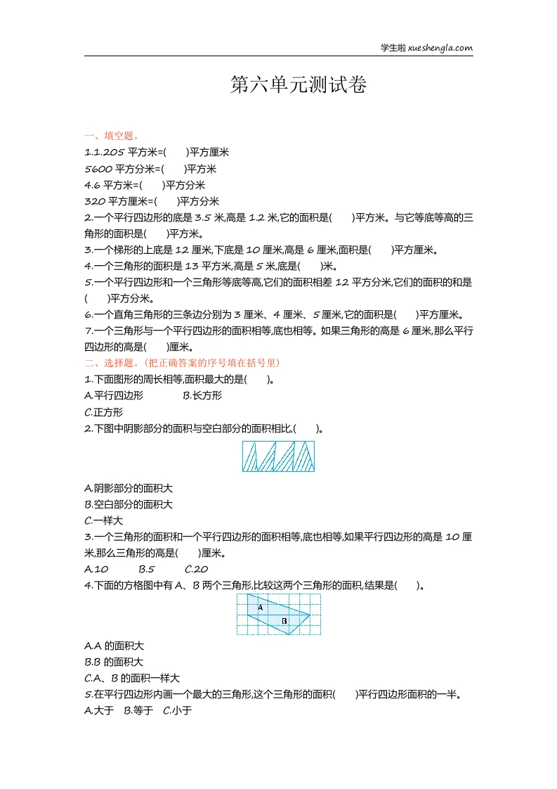 首页小学数学五年级冀教版数学五年级上册第六单元测试卷及答案