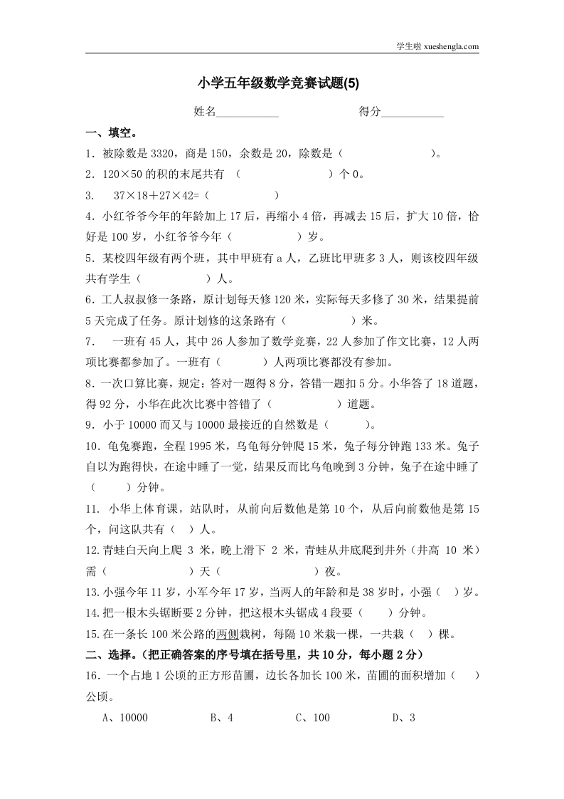 首页小学数学五年级小学五年级数学竞赛试题(5)