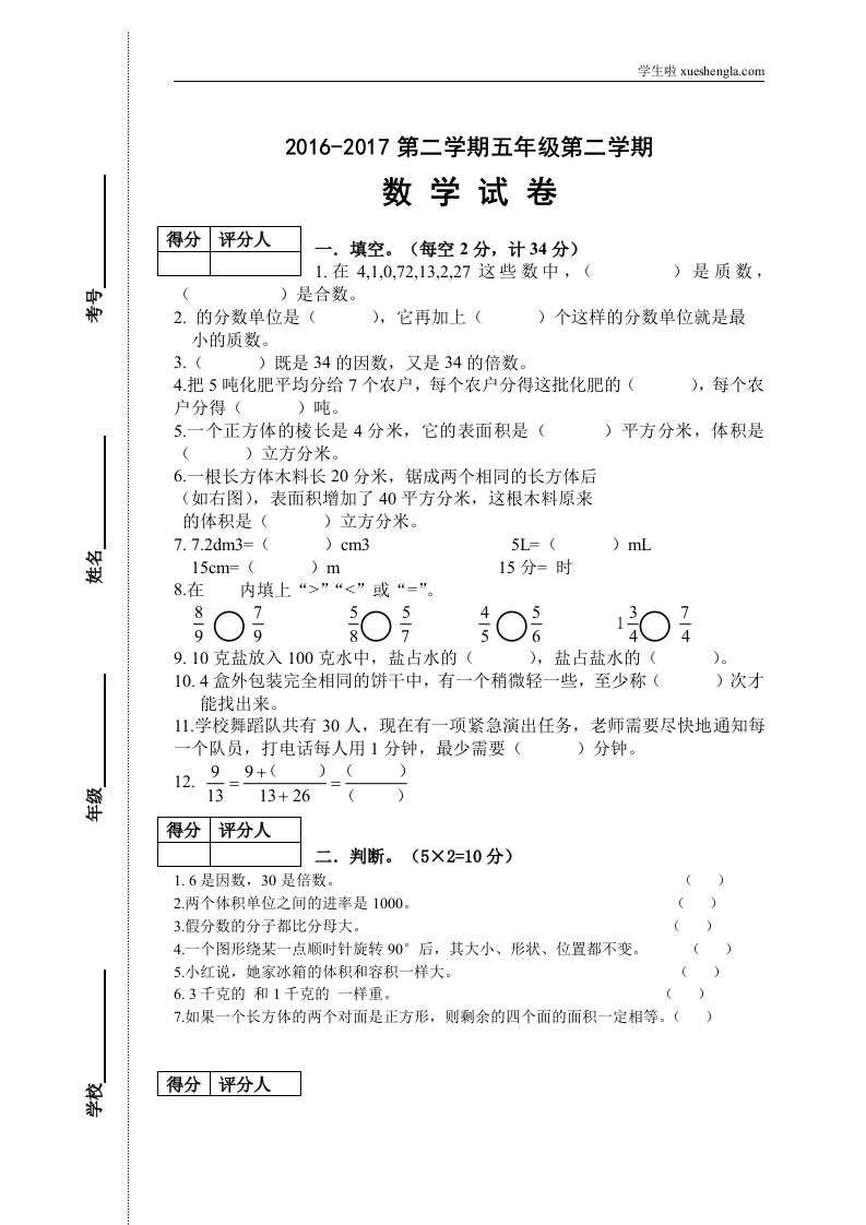 五年级数学试卷模板