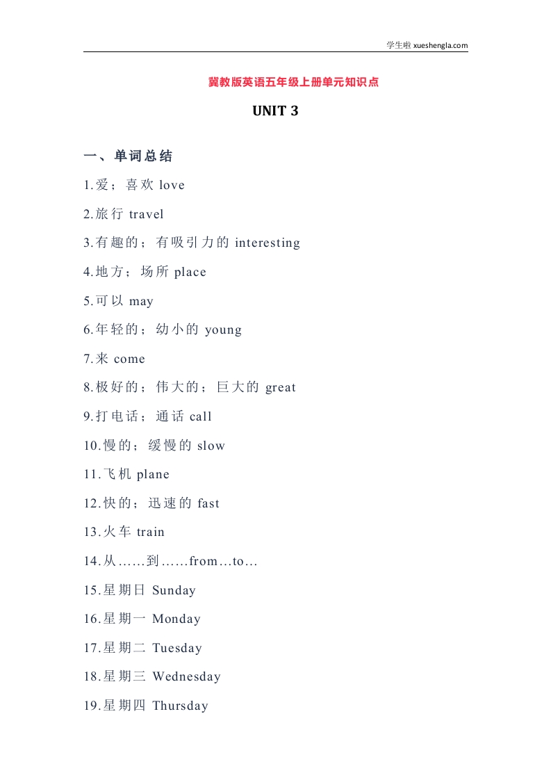 首页小学英语五年级冀教版英语五年级上册Unit3单元知识点