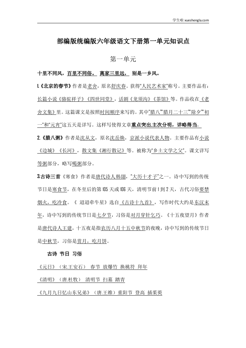 部编版统编版六年级语文下册课文阅读第一单元知识点