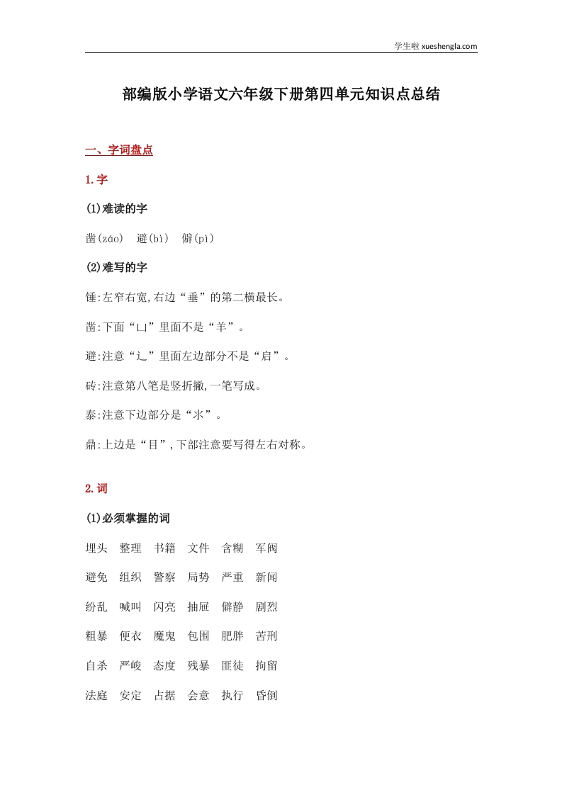 首页小学语文六年级部编版小学语文六年级下册第四单元知识点总结