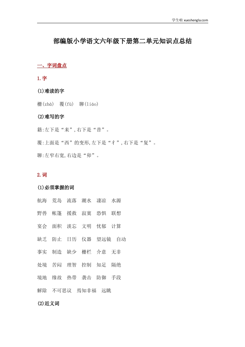 首页小学语文六年级部编版小学语文六年级下册第二单元知识点总结