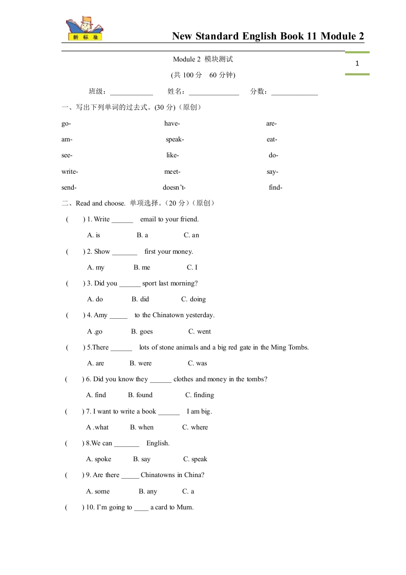 (一年级起点)六年级上册M2模块测试题