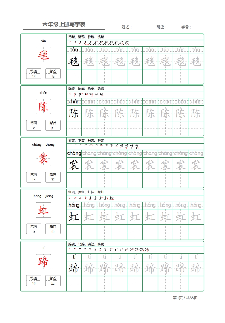 首页小学语文六年级统编语文 写字表六年级上册 字帖