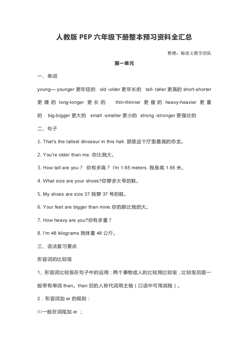 人教版PEP六年级下册整本预习资料全汇总