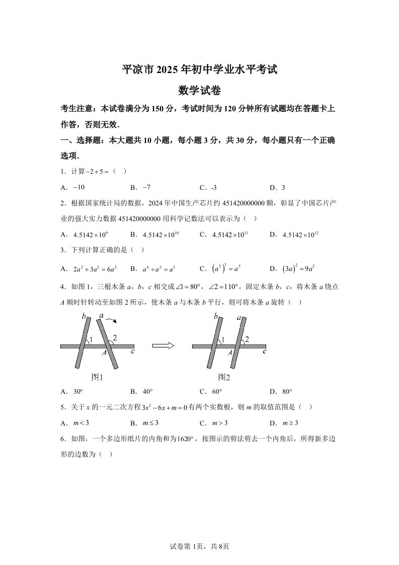 首页中考数学2025年甘肃省平凉市中考真题数学试题