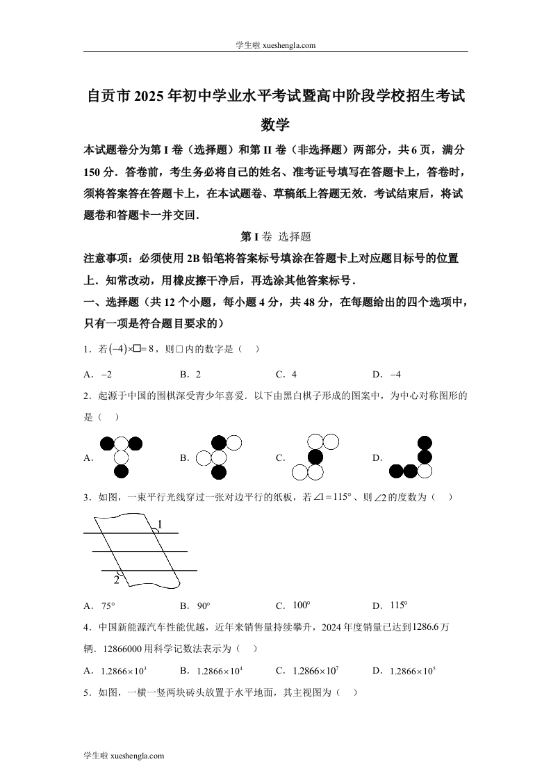 首页中考数学2025年四川省自贡市中考数学试题