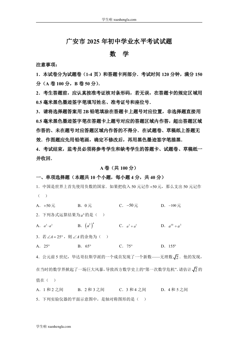 2025年四川省广安市中考数学试题