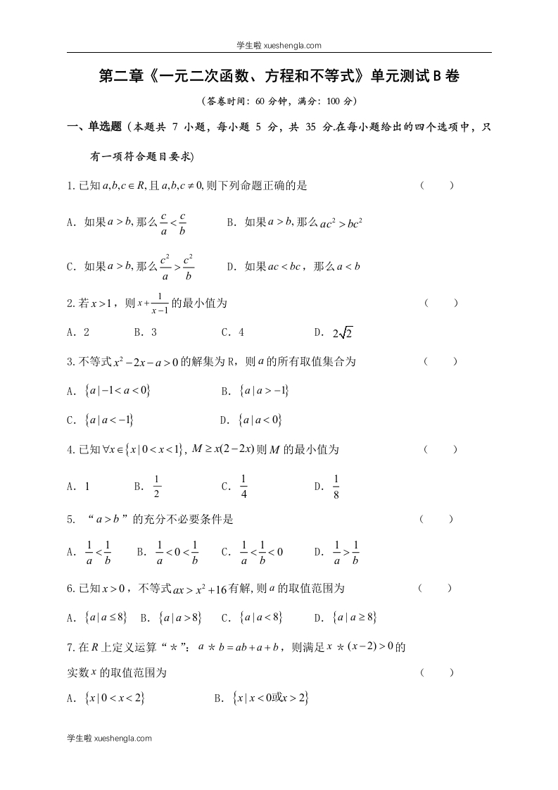 首页高中数学高一第二章《一元二次函数、方程和不等式》单元测试B卷——高一上学期数学人教A版(2019)必修第一册