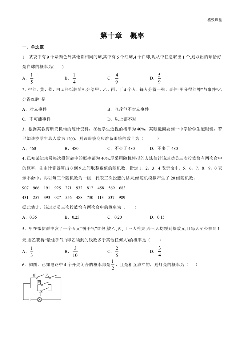【新教材精创】第十章 概率章末总结 同步练习(2)(原卷版)