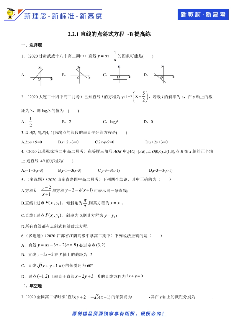 首页高中数学高一【新教材精创】2.2.1 直线的点斜式方程 B提高练(原卷版)