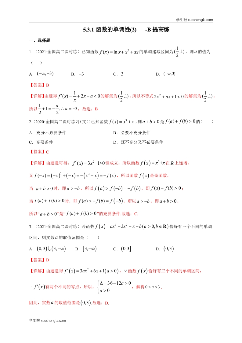 首页高中数学高二5.3.1函数的单调性(2) -B提高(解析版)