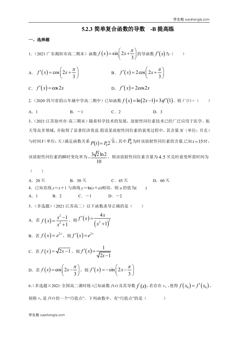 首页高中数学高二5.2.3简单复合函数的导数 -B提高(学生版)