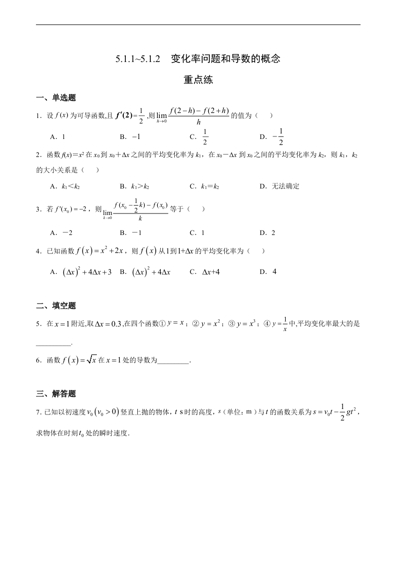 5.1.1~5.1.2 变化率问题和导数的概念(重点练)-高二数学十分钟同步课堂专练(人教A版选择性必修第二册)