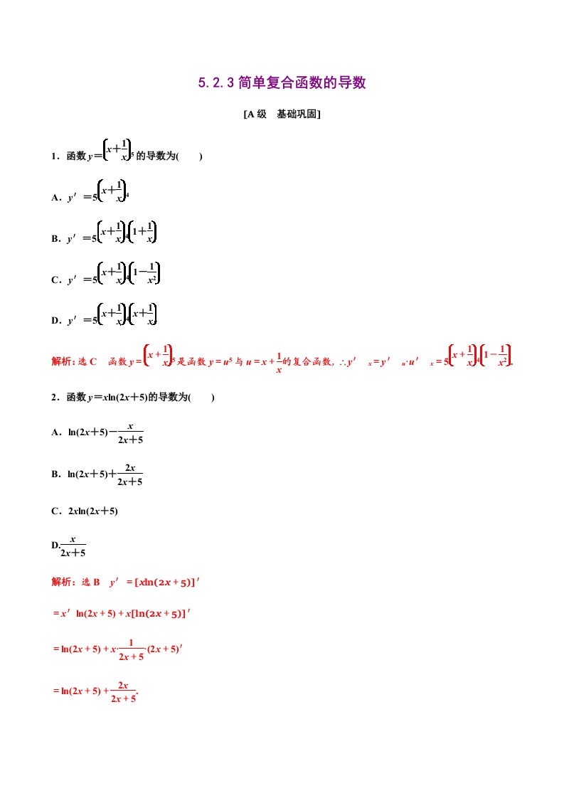 5.2.3简单复合函数的导数(解析版)(作业)-【上好课】高二数学同步备课系列(人教A版2019选择性必修第二册)
