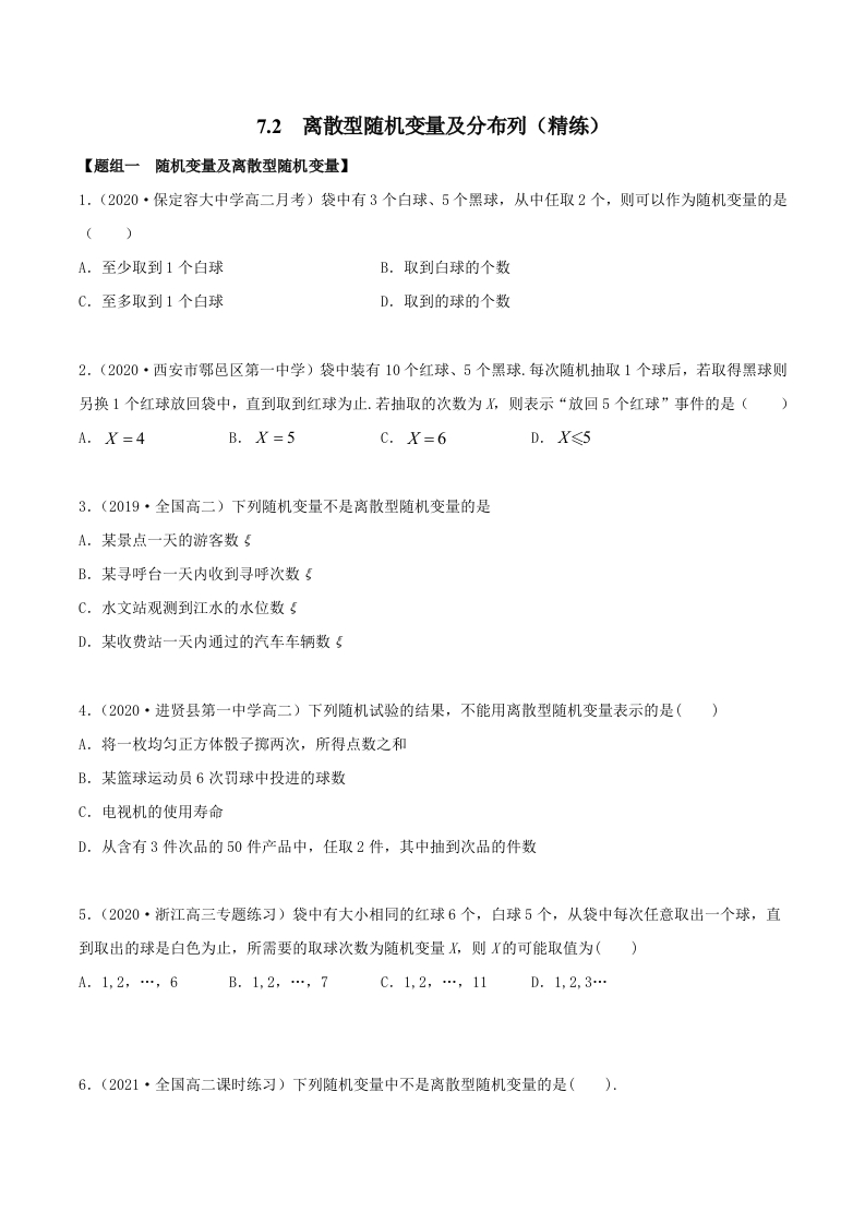 首页高中数学高二7.2 离散型随机变量及分布列(精练)(原卷版)