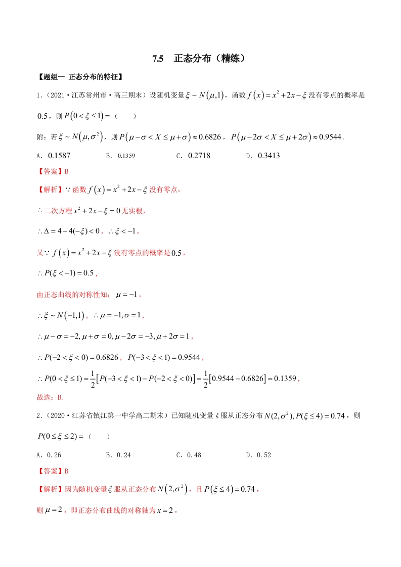 首页高中数学高二7.5 正态分布(精练)(解析版)