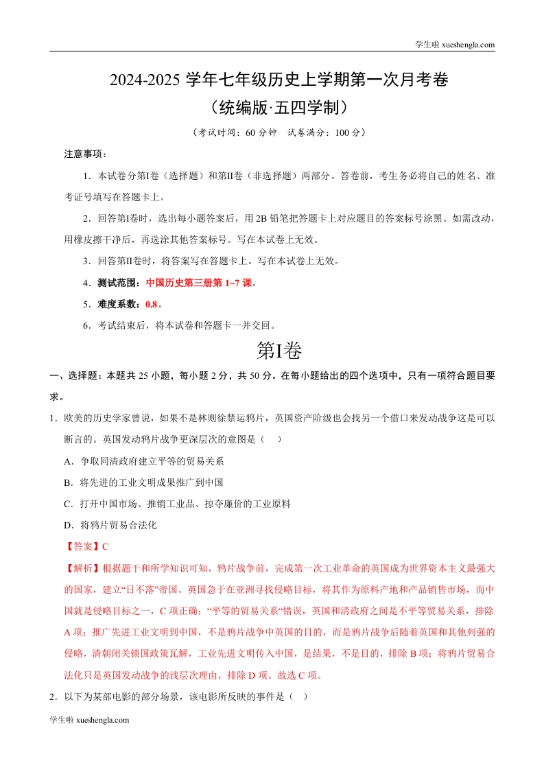 七年级历史第一次月考卷(全解全析)(统编版·五四学制)