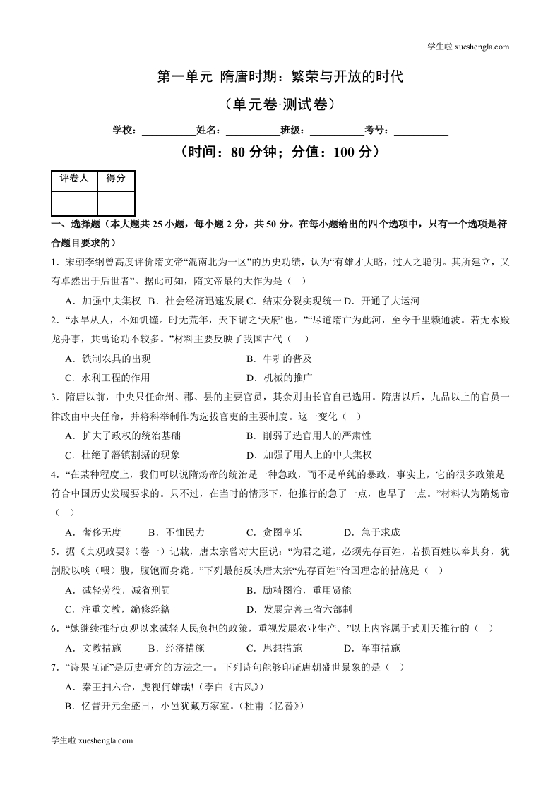 第一单元 隋唐时期:繁荣与开放的时代【单元卷·测试卷】(附答案解析)-2024-2025学年七年级历史下册单元速记·巧练(统编版2024)