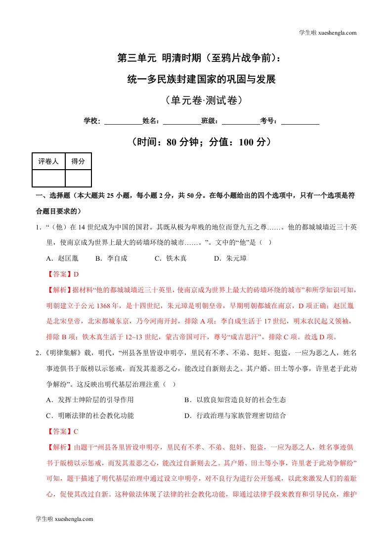 第三单元 明清时期(至鸦片战争前):统一多民族封建国家的巩固与发展【单元卷·测试卷】(解析版)