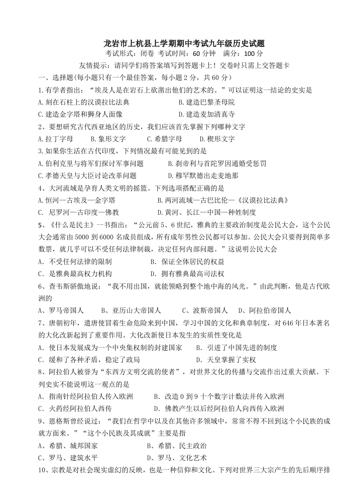 01. 福建省龙岩市上杭县期中考试九年级历史试题