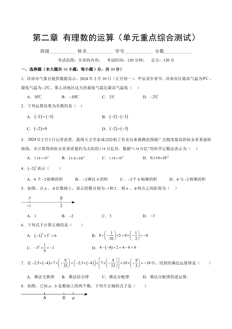 首页初中数学七年级第二章 有理数的运算(单元重点综合测试)(原卷版)