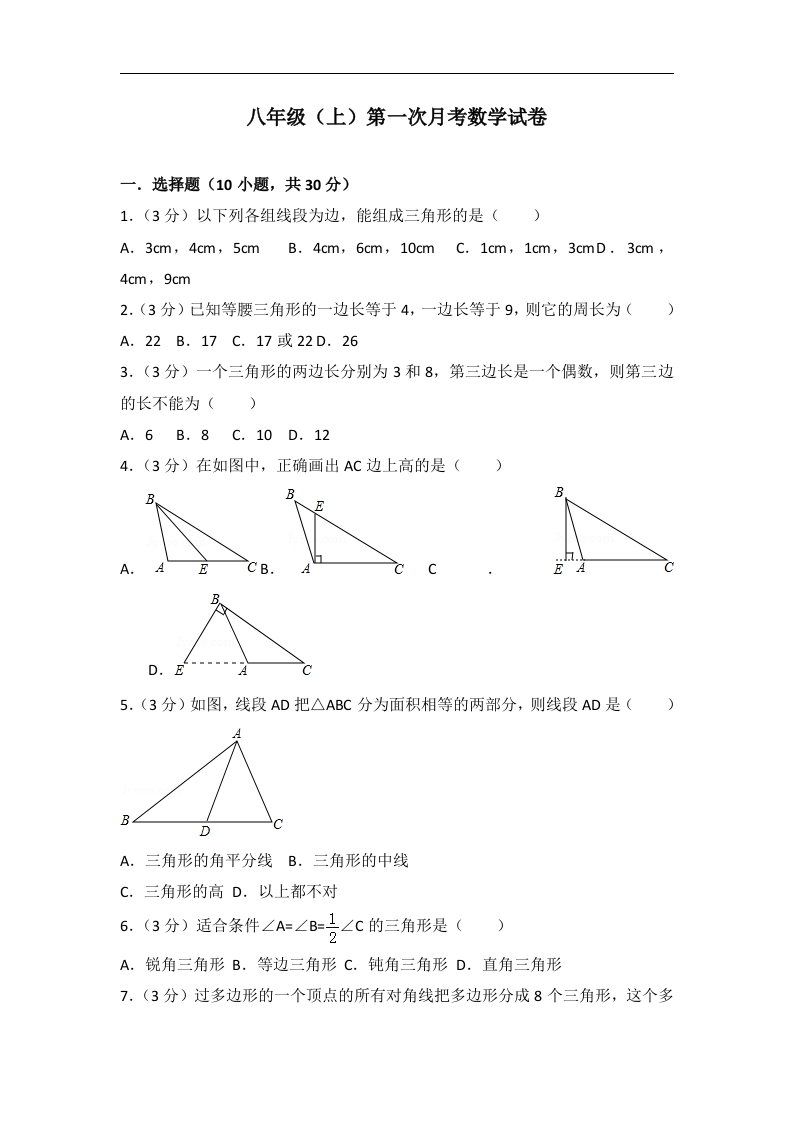 首页初中数学八年级04 【人教版】八年级上第一次月考数学试卷