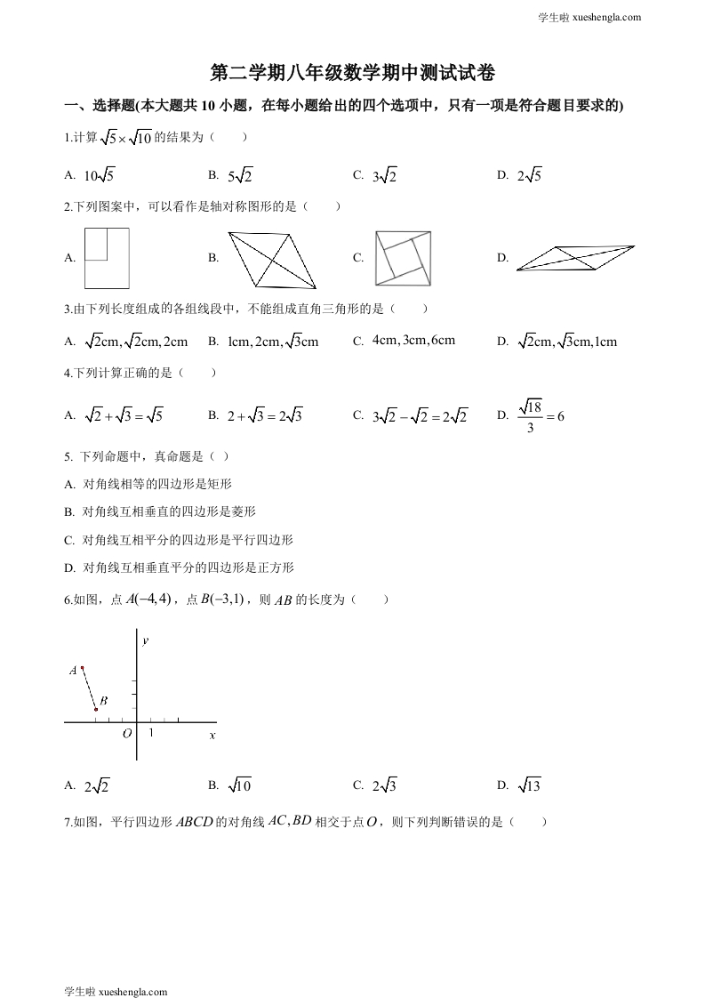 首页初中数学八年级09 【人教版】八年级下期中数学试卷(含答案)