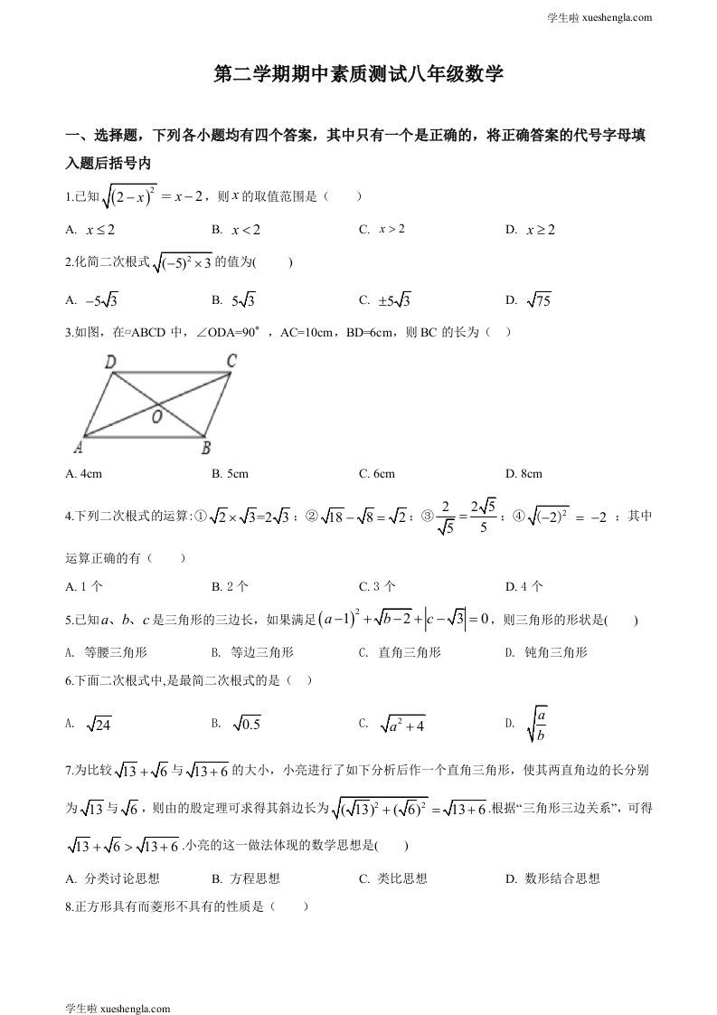 首页初中数学八年级04 【人教版】八年级下期中数学试卷(含答案)