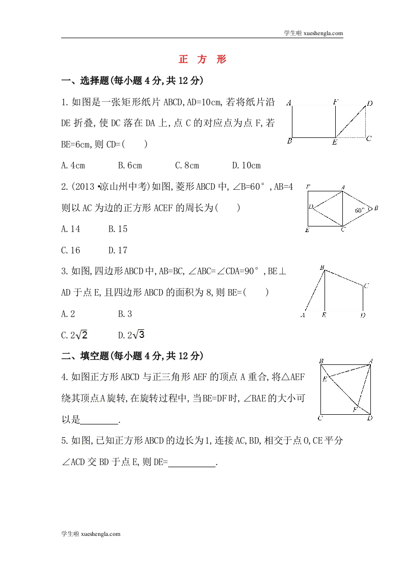 八年级数学下册知识点汇聚测试卷:正方形(含详解) (1)