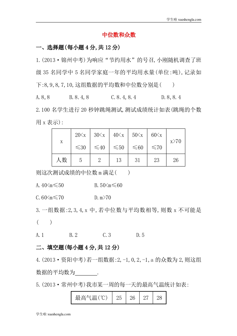 八年级数学下册知识点汇聚测试卷:中位数和众数初级测试(中考冲刺复习通用,含详解) (1)