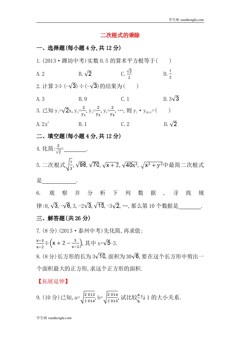 八年级数学下册知识点汇聚测试卷:二次根式的乘除深入测试(含详解) (1)