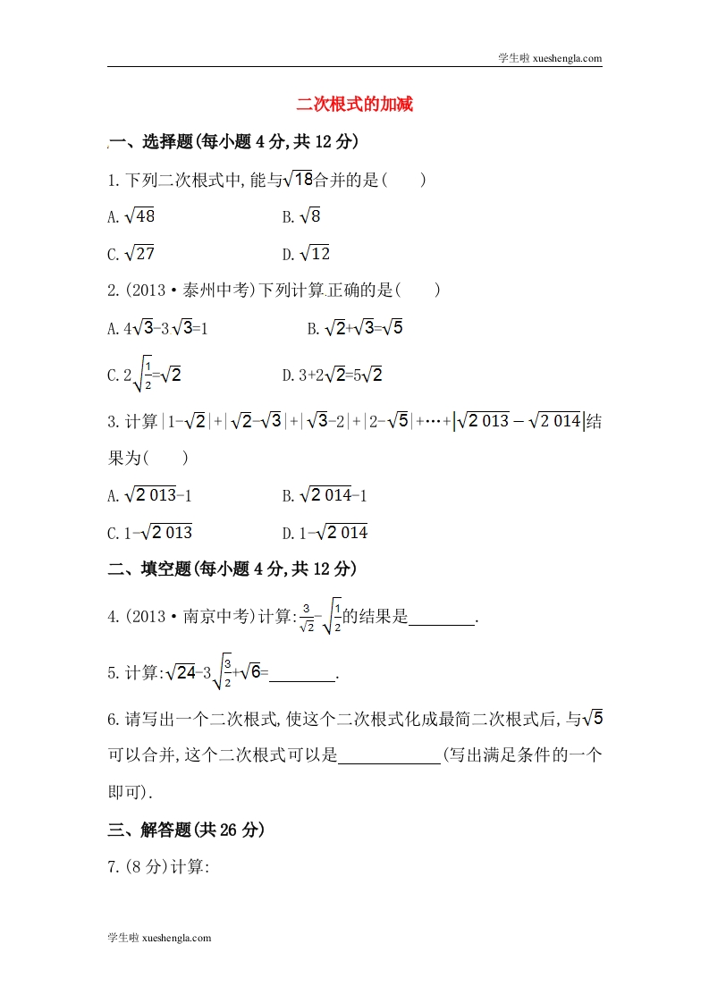 八年级数学下册知识点汇聚测试卷:二次根式的加减初级测试(含详解) (1)