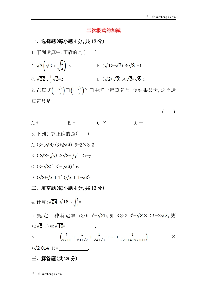 八年级数学下册知识点汇聚测试卷:二次根式的加减深入测试(含详解) (1)