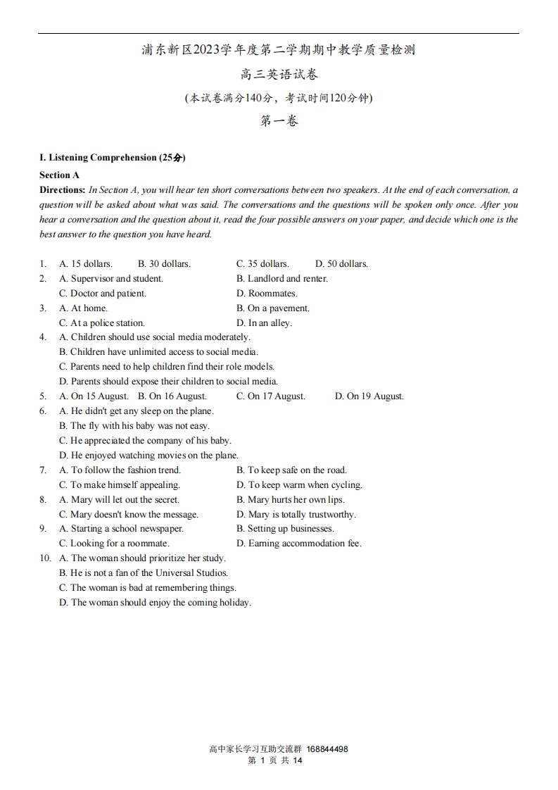 2024届浦东新区高三英语二模