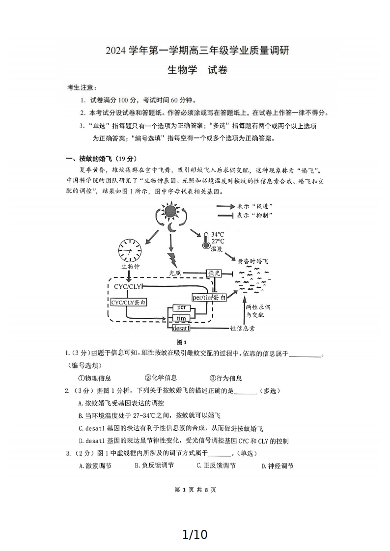 上海市奉贤区2024-2025学年高三上学期一模生物试题-含答案