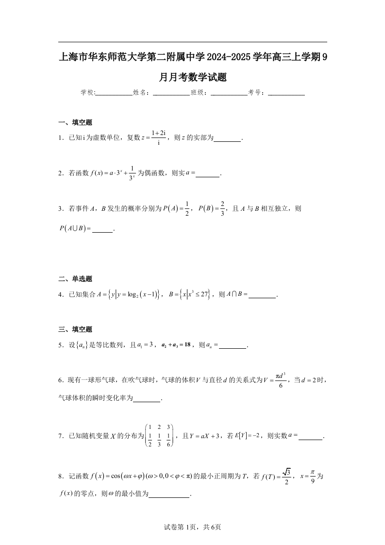 上海市华东师范大学第二附属中学2024-2025学年高三上学期9月月考数学试题