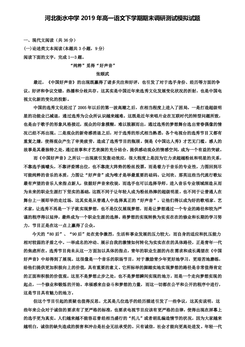 河北衡水中学2019年高一语文下学期期末调研测试模拟试题(解析版)