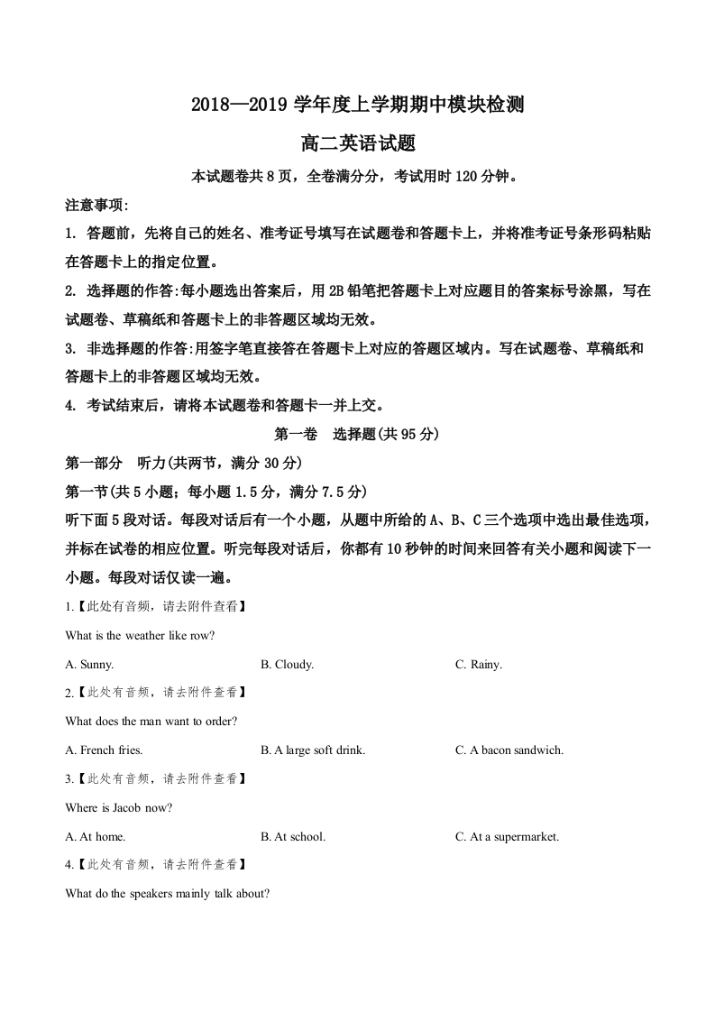 衡水中学2018-2019学年高二上学期期中考试(含听力)英语试题(原卷版)