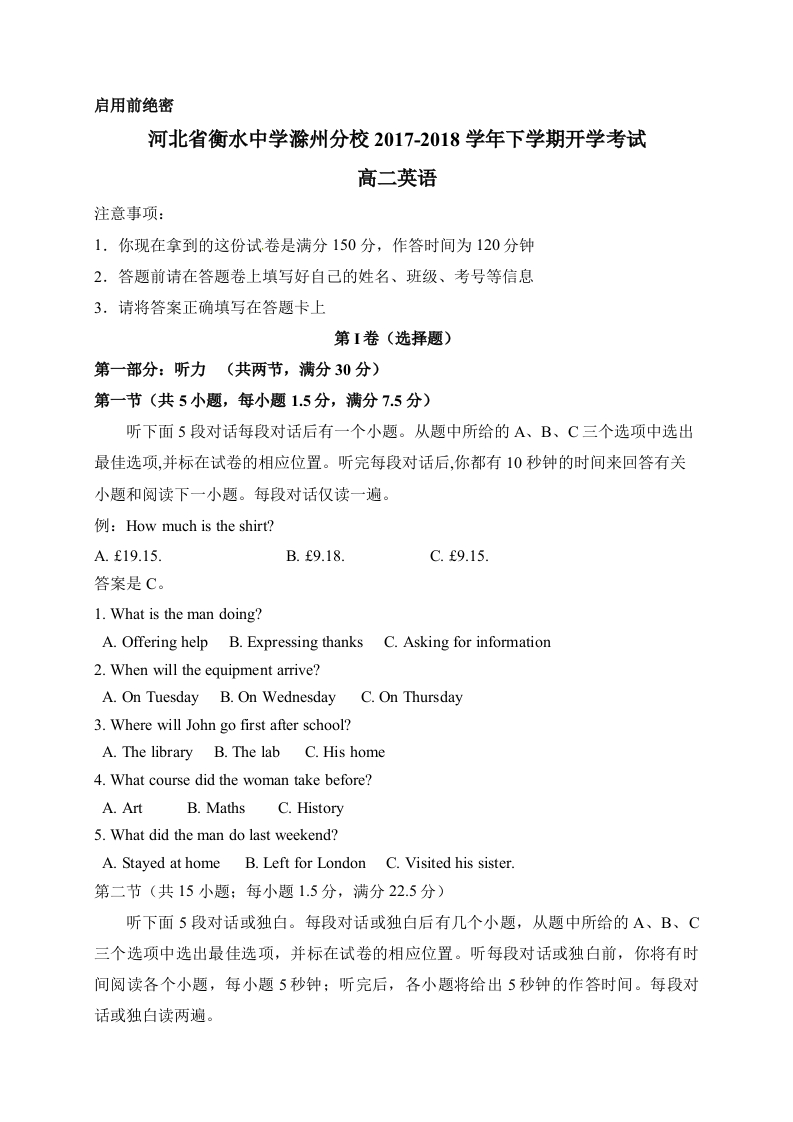 学生啦:启用前绝密河北省衡水中学滁州分校2017-2018学年下学期开学考试高二英语注意事项:1.你现在拿到的这份试卷是满分150分,作答时间为120分钟2.答题前请在答题卷上填写好自己的姓名、班级、考号等信息3.请将答案正确填写在答题卡上第I卷(选择题)第一部分:听力(共两节,满分30分)第一节(共5小题,每小题1.5分,满分7.5分)听下面5段对话每段对话后有一个小题。从题中所给的A、B、C三个选项中选出最佳选项,并标在试卷的相应位置。听完每段对话后,你都有10秒钟的时间来回答有关小题和阅读下一小题。每段对话仅读一遍。例:How much is the shirt?A.£19.15.B.f9.18.C.f9.15.答案是C。1.What is the man doing?A.Offering help B.Expressing thanks C.Asking for information2.When will the equipment arrive?A.On Tuesday B.On Wednesday C.On Thursday3.Where will John go first after school?A.The library B.The lab C.His home4.What course did the woman take before?A.ArtB.Maths C.History5.What did the man do last weekend?A.Stayed at home B.Left for London C.Visited his sister.第二节(共15小题:每小题1.5分,满分22.5分)听下面5段对话或独白。每段对话或独白后有几个小题,从题中所给的A、B、C三个选项中选出最佳选项,并标在试卷的相应位置。听每段对话或独白前,你将有时间阅读各个小题,每小题5秒钟:听完后,各小题将给出5秒钟的作答时间。每段对话或独白读两遍。