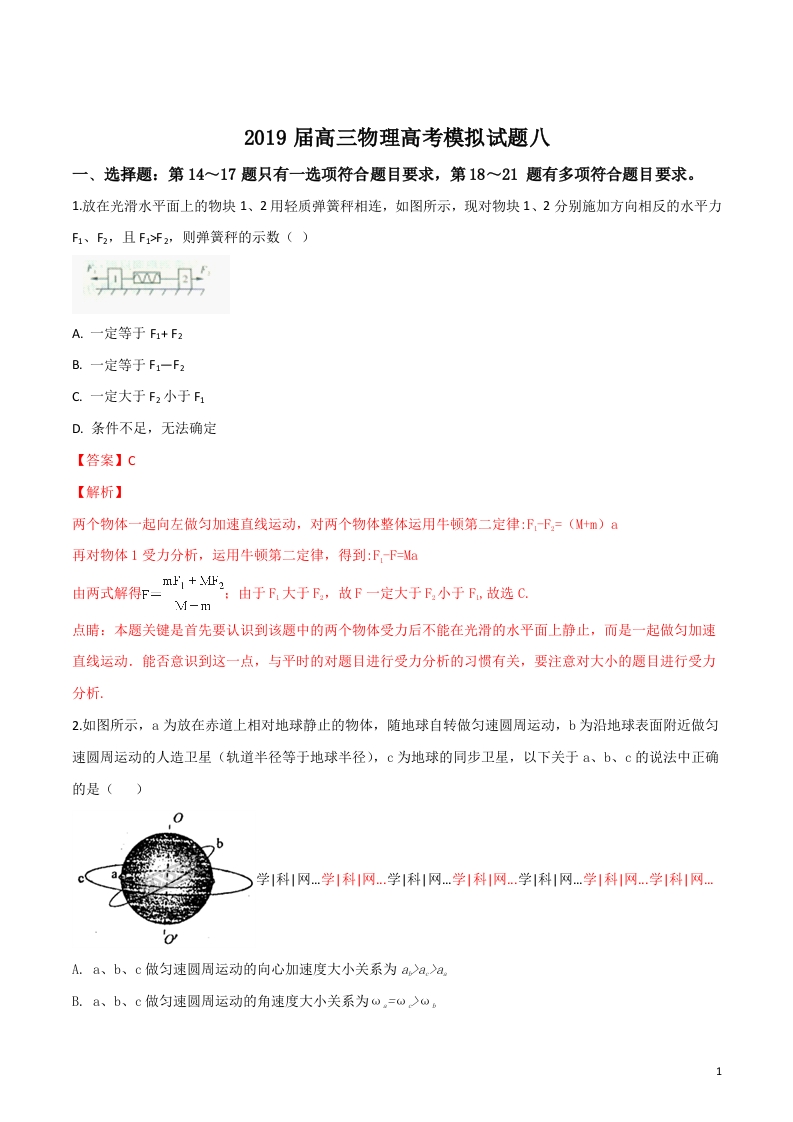 学生啦:2019届高三物理高考模拟试题八一、选择题:第14~17题只有一选项符合题目要求,第18~21题有多项符合题目要求。1放在光滑水平面上的物块1、2用轻质弹簧秤相连,如图所示,现对物块1、2分别施加方向相反的水平力F1、F2,且FF2,则弹簧秤的示数()A.一定等于F1+F2B.一定等于F1-F2C.一定大于F2小于F1D.条件不足,无法确定【答案】C【解析】两个物体一起向左做匀加速直线运动,对两个物体整体运用牛顿第二定律:F,一F,=(+m)a再对物体1受力分析,运用牛顿第二定律,得到:F-F-Mam+2由两式解得F=:由于F大于F,故F一定大于F小于F,故选C.M-m点睛:本题关键是首先要认识到该题中的两个物体受力后不能在光滑的水平面上静止,而是一起做匀加速直线运动.能否意识到这一点,与平时的对题目进行受力分析的习惯有关,要注意对大小的题目进行受力2.如图所示,a为放在赤道上相对地球静止的物体,随地球自转做匀速圆周运动,为沿地球表面附近做匀速圆周运动的人造卫星(轨道半径等于地球半径),c为地球的同步卫星,以下关于a、、c的说法中正确的是()0A.a、b、c做匀速圆周运动的向心加速度大小关系为a,a>a。1