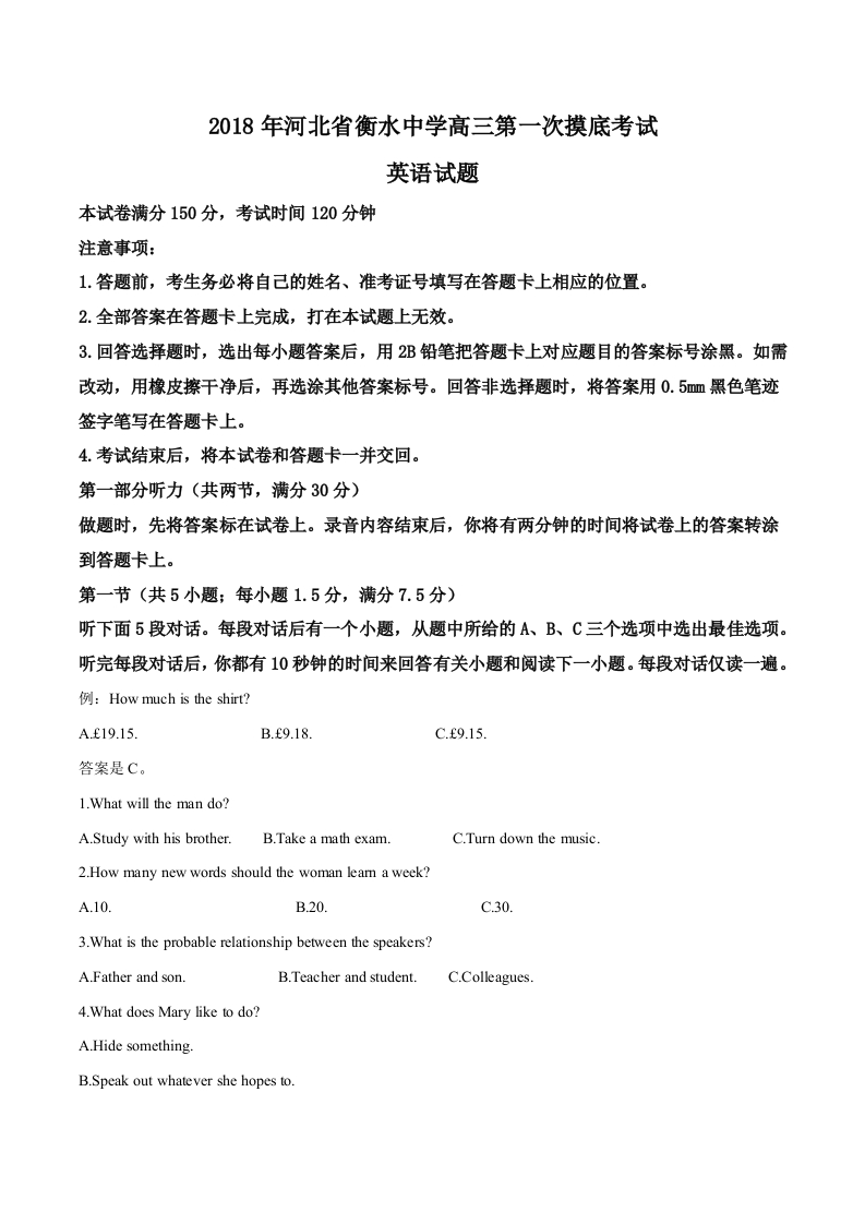 学生啦:2018年河北省衡水中学高三第一次摸底考试英语试题本试卷满分150分,考试时间120分钟注意事项:1.答题前,考生务必将自己的姓名、准考证号填写在答题卡上相应的位置。2.全部答案在答题卡上完成,打在本试题上无效。3.回答选择题时,选出每小题答案后,用2B铅笔把答题卡上对应题目的答案标号涂黑。如需改动,用橡皮擦干净后,再选涂其他答案标号。回答非选择题时,将答案用0.5黑色笔迹签字笔写在答题卡上。4.考试结束后,将本试卷和答题卡一并交回。第一部分听力(共两节,满分30分)做题时,先将答案标在试卷上。录音内容结束后,你将有两分钟的时间将试卷上的答案转涂到答题卡上。第一节(共5小题:每小题1.5分,满分7.5分)听下面5段对话。每段对话后有一个小题,从题中所给的A、B、C三个选项中选出最佳选项。听完每段对话后,你都有10秒钟的时间来回答有关小题和阅读下一小题。每段对话仅读一遍。例:How much is the shirt?B.f9.18.C.9.15.答案是C。1.What will the man do?A.Study with his brother.B.Take a math examC.Turn down the music.2.How many new words should the woman leam a week?A.10.C.30.3.What is the probable relationship between the speakers?A.Father and son.B.Teacher and student.C.Colleagues.4.What does Mary like to do?A.Hide something.B.Speak out whatever she hopes to.