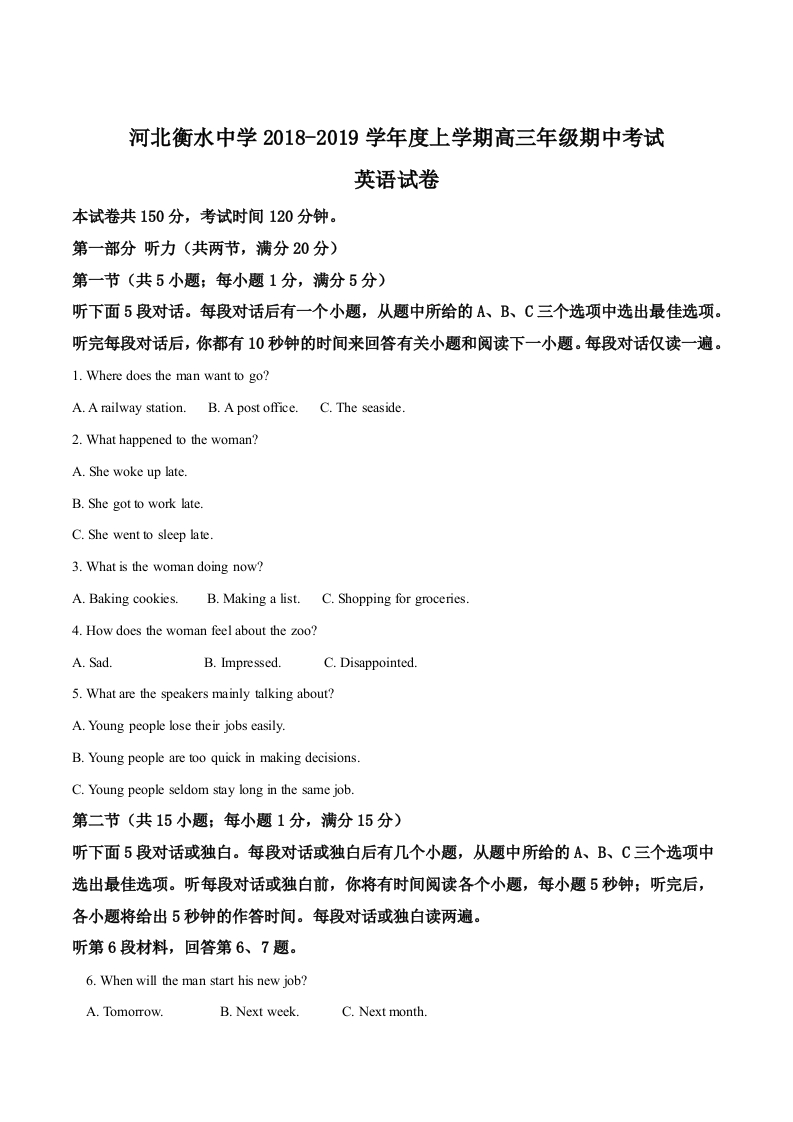 学生啦:河北衡水中学2018-2019学年度上学期高三年级期中考试英语试卷本试卷共150分,考试时间120分钟。第一部分听力(共两节,满分20分)第一节(共5小题:每小题1分,满分5分)听下面5段对话。每段对话后有一个小题,从题中所给的A、B、C三个选项中选出最佳选项。听完每段对话后,你都有10秒钟的时间来回答有关小题和阅读下一小题。每段对话仅读一遍。1.Where does the man want to go?A.A railway station.B.A post office.C.The seaside.2.What happened to the woman?A.She woke up late.B.She got to work late.C.She went to sleep late.3.What is the woman doing now?A.Baking cookies.B.Making a list.4.How does the woman feel about the zoo?A.Sad.C.Disappointed.5.What are the speakers mainly talking about?A.Young people lose their jobs easily.B.Young people are too quick in making decisions.C.Young people seldom stay long in the same job.第二节(共15小题;每小题1分,满分15分)听下面5段对话或独白。每段对话或独白后有几个小题,从题中所给的A、B、C三个选项中选出最佳选项。听每段对话或独白前,你将有时间阅读各个小题,每小题5秒钟:听完后,各小题将给出5秒钟的作答时间。每段对话或独白读两遍。听第6段材料,回答第6、7题。6.When will the man start his new job?A.Tomorrow.B.Next weekC.Next month