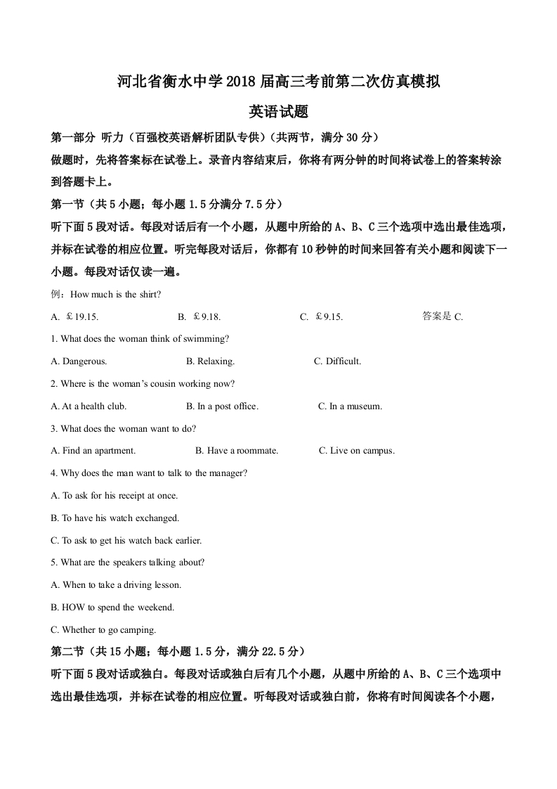 学生啦:河北省衡水中学2018届高三考前第二次仿真模拟英语试题第一部分听力(百强校英语解析团队专供)(共两节,满分30分)做题时,先将答案标在试卷上。录音内容结束后,你将有两分钟的时间将试卷上的答案转涂到答题卡上。第一节(共5小题;每小题1.5分满分7.5分)听下面5段对话。每段对话后有一个小题,从题中所给的A、B、C三个选项中选出最佳选项,并标在试卷的相应位置。听完每段对话后,你都有10秒钟的时间来回答有关小题和阅读下一小题。每段对话仅读一遍。例:How much is the shirt??A.£19.15B.£9.18C.£9.15.答案是C.1.What does the woman think of swimming?A.Dangerous.B.Relaxing.C.Difficult.2.Where is the woman's cousin working now?A.At a health club.B.In a post office.C.In a museum.3.What does the woman want to do?A.Find an apartment.B.Have a roommate.C.Live on campus.4.Why does the man want to talk to the manager?A.To ask for his receipt at once.B.To have his watch exchanged.C.To ask to get his watch back earlier.5.What are the speakers talking about?A.When to take a driving lesson.B.HOW to spend the weekend.C.Whether to go camping.第二节(共15小题;每小题1.5分,满分22.5分)听下面5段对话或独白。每段对话或独白后有几个小题,从题中所给的A、B、C三个选项中选出最佳选项,并标在试卷的相应位置。听每段对话或独白前,你将有时间阅读各个小题,
